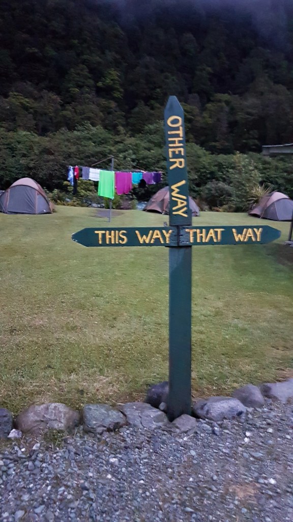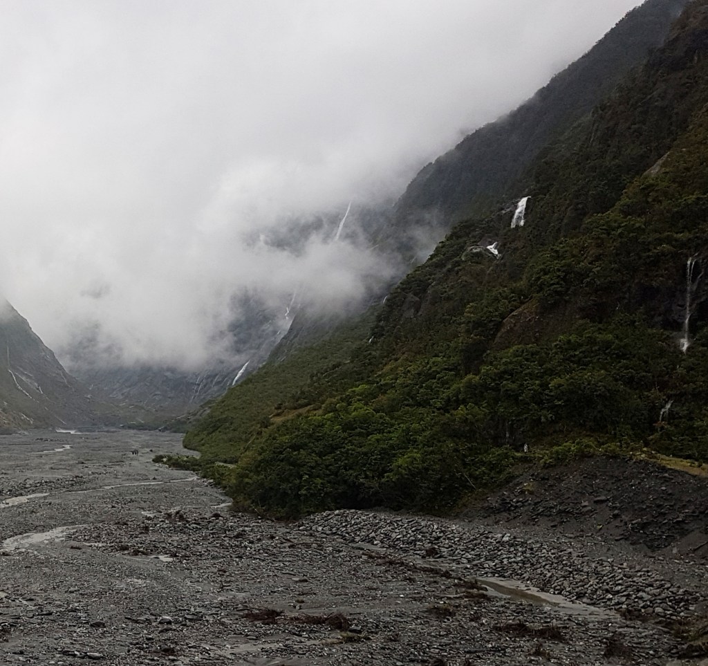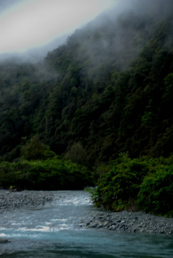 אבל במקום שני המקומות היפים האלו – זכינו לחוויה ניו זילנדית אחרת: גשם. ניו זילנד מאוד ירוקה – ולא סתם – היא מאוד גשומה. לא מדובר על גשם חזק (לרוב), אלא על גשם קל אך טורדני שלא מפסיק במשך שעות. והגשם הזה התחיל לרדת ביום הזה – כך שלא רק שלא היו השתקפויות באגם, אבל לא רק שהסיור במסוק בוטל בגלל תנאי מזג האוויר, אלא הדרך לקרחון היתה חסומה בגלל שהמסלול חצה כמה נחלים שלרוב היו קטנים – אבל בגלל הגשם גדלו והפכו להיות מסוכנים מידי לחציה, ולכן המסלול נסגר.