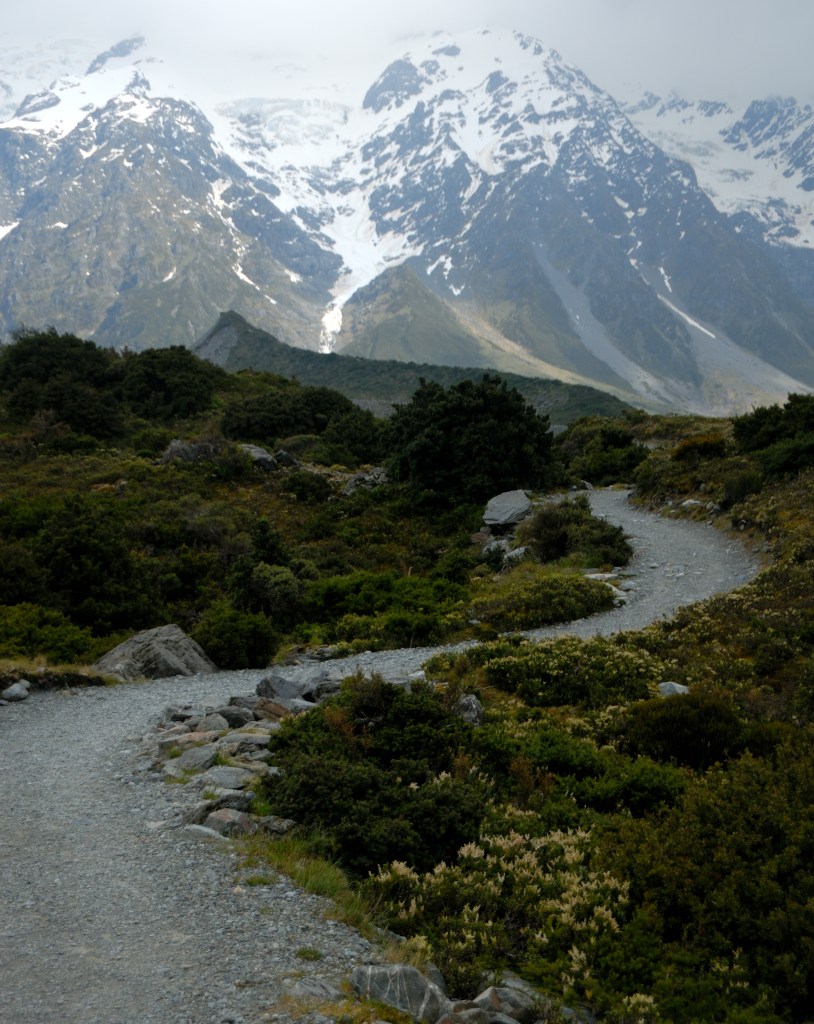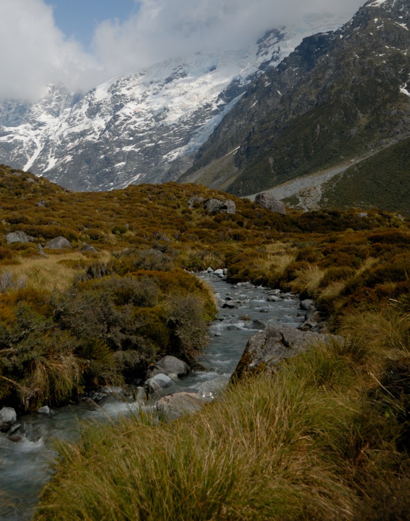 ביום הבא של הטיול היה מסלול הליכה שמאוד ציפיתי לו בשם עמק הוקר Hooker Valley – שהוא מסלול קל להליכה. המסלול בעצם נמצא בבסיסו של ההר הכי גבוה בניו זילנד, הר קוק Mt. Cook. בגלל מגבלת זמן לא הספקתי להגיע לסופו, אבל הגעתי לנקודה שבה יכולתי לראות את ההר ולצלם אותו.