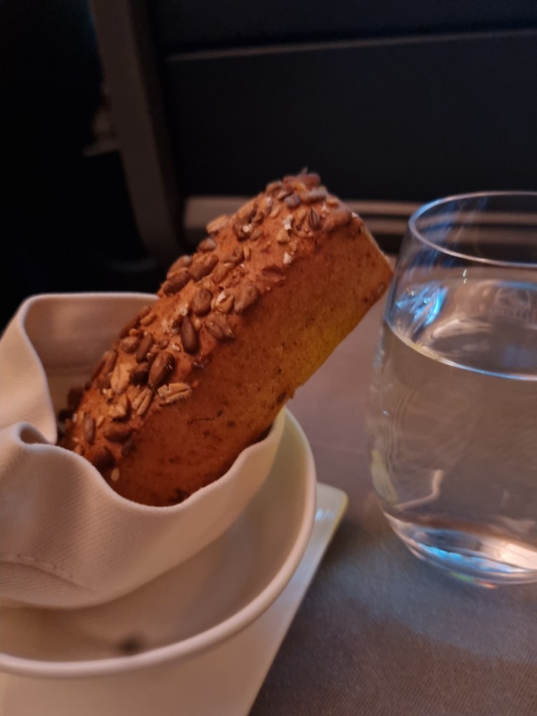 אחרי שהאגוזים והמשקאות הוגשו לכל המטוס, הדיילים עברו עם סידור שולחן בסיסי שכלל ״נר״ (שהיה מנורה בתוך מעין פמוט מנייר) עםחמאה ותבלינים בסיסיים, שמיד אחריו קיבלנו לחם מחומם: