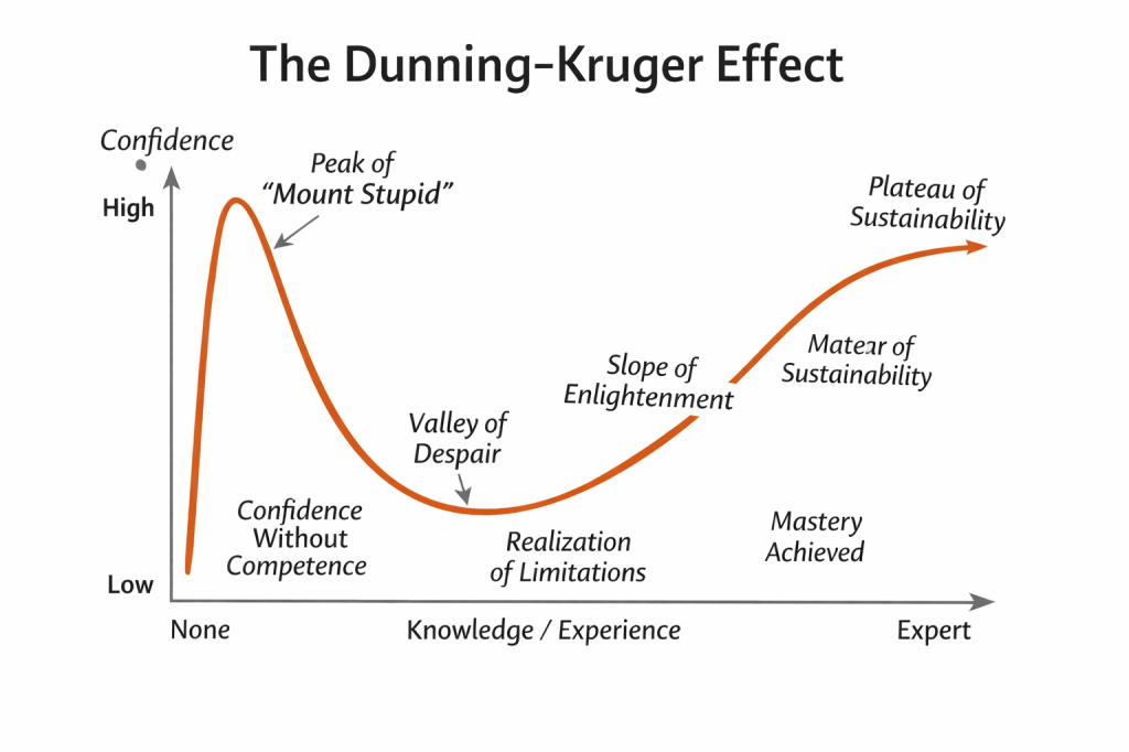 אני מניחה שרובנו מכירים את ״אפקט דאנינג – קרוגר״. מדובר על הטיה קוגניטיבית שלפיה אנשים עם ידע מצומצם מאוד בטוחים בהבנה שלהם בתחום, בין השאר כי הם לא מבינים את היקף הידע שנדרש כדי להבין את התחום המדובר לעומק. אבל במקביל לכך אנשים עם ידע ויכולת מספיק גבוהים כדי להעריך את המצב – יניחו שגם אנשים אחרים מבינים כמוהם ולכן יעריכו את היכולות שלהם לעומת אחרים כנמוכה יותר מזו שהיא במציאות
